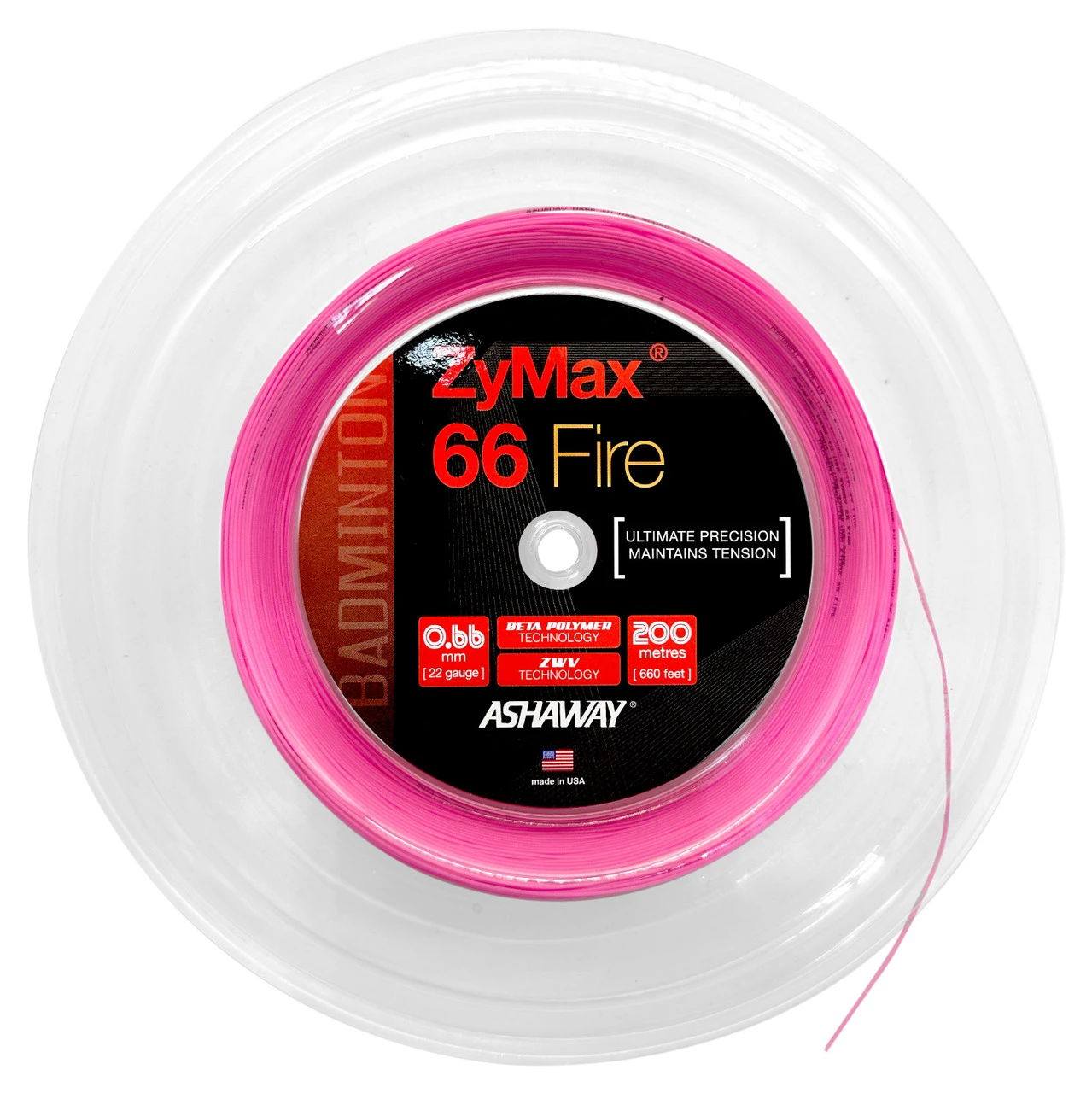 Ashaway ZyMax 66 Fire Badminton is produced from Ashaway’s revolutionary BETA Polymer raw material and is designed for maximum repulsion and shuttle response. Offering superior strength and high performance playability, ZyMax 66 Fire is tailored for players at the higher end spectrum for precise shot making who prefer a stiffer, more controlled string bed.