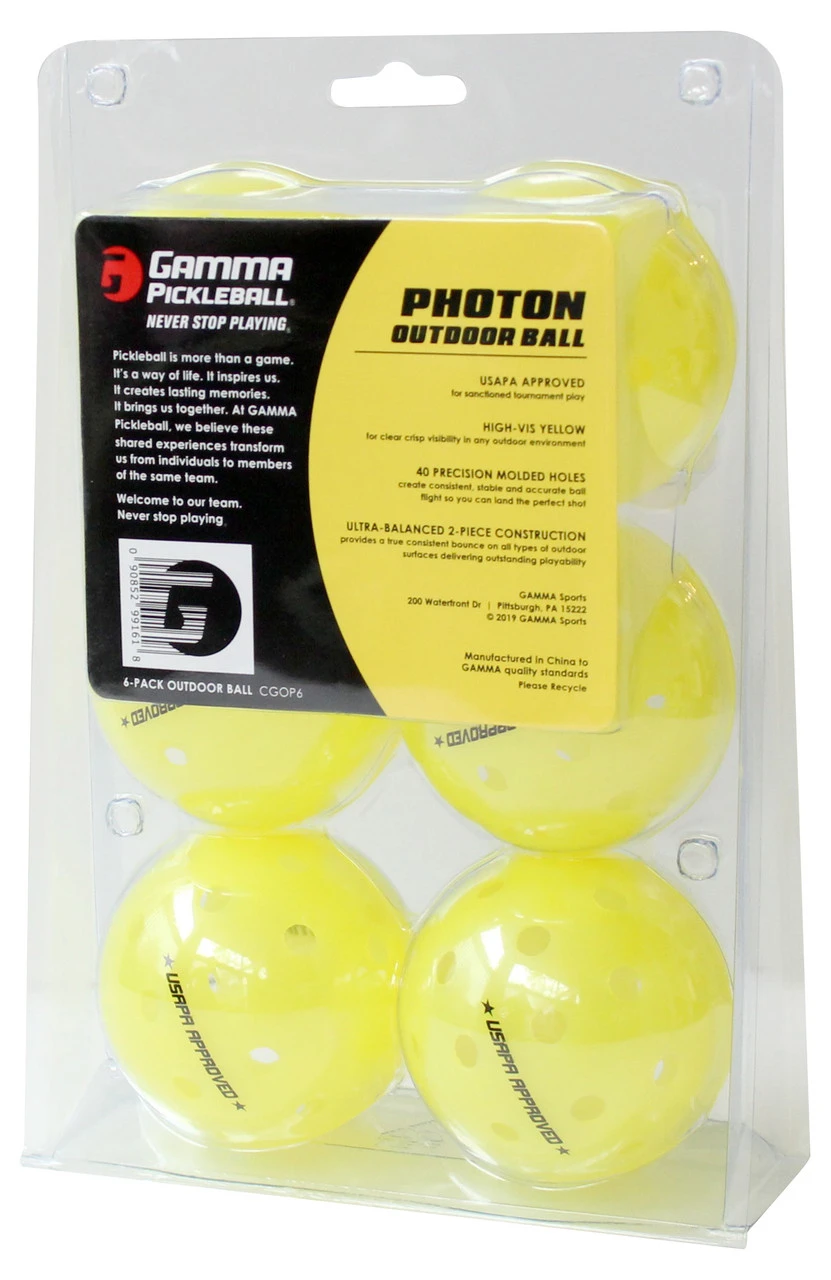 GAMMA Photon Outdoor Pickleball Balls are a two-piece construction which offer a consistent bounce. Featuring 40 holes for a stable and accurate flight, in addition to the neon yellow colour ensuring the Photon Outdoor ball is highly visible in any type of light.