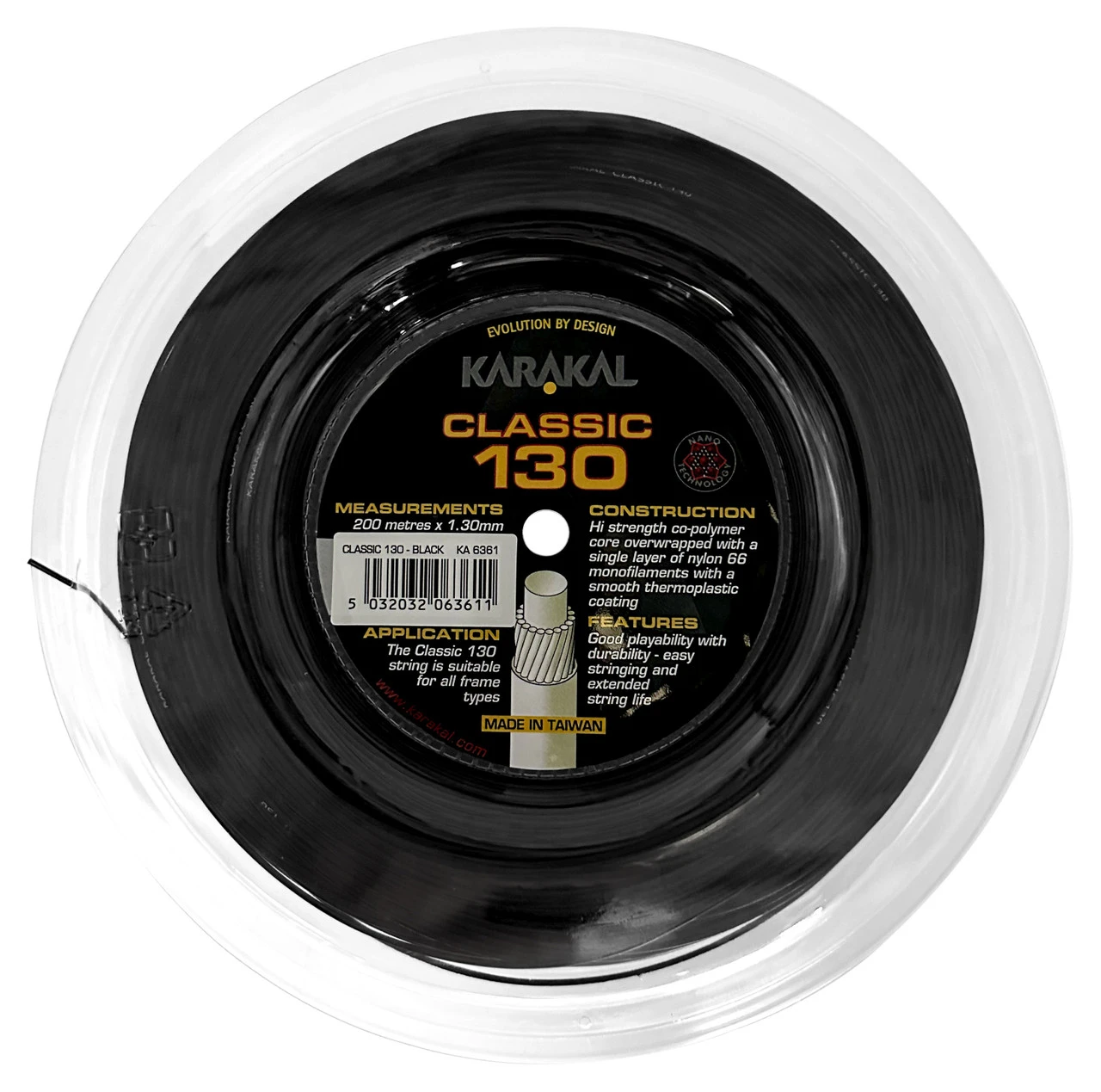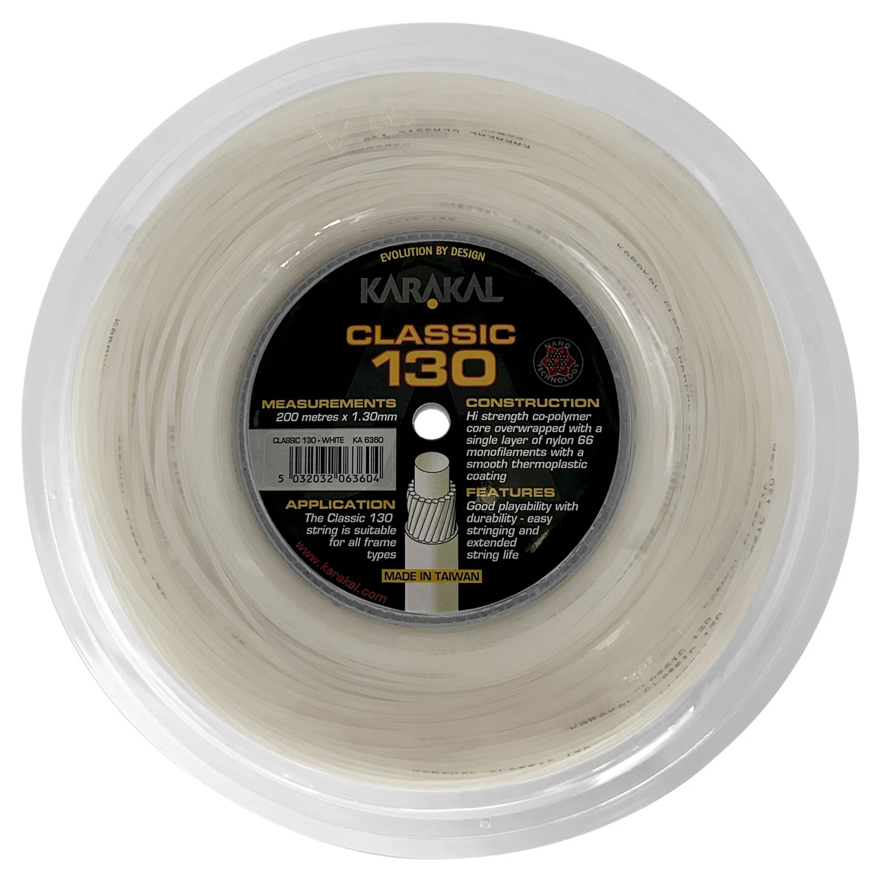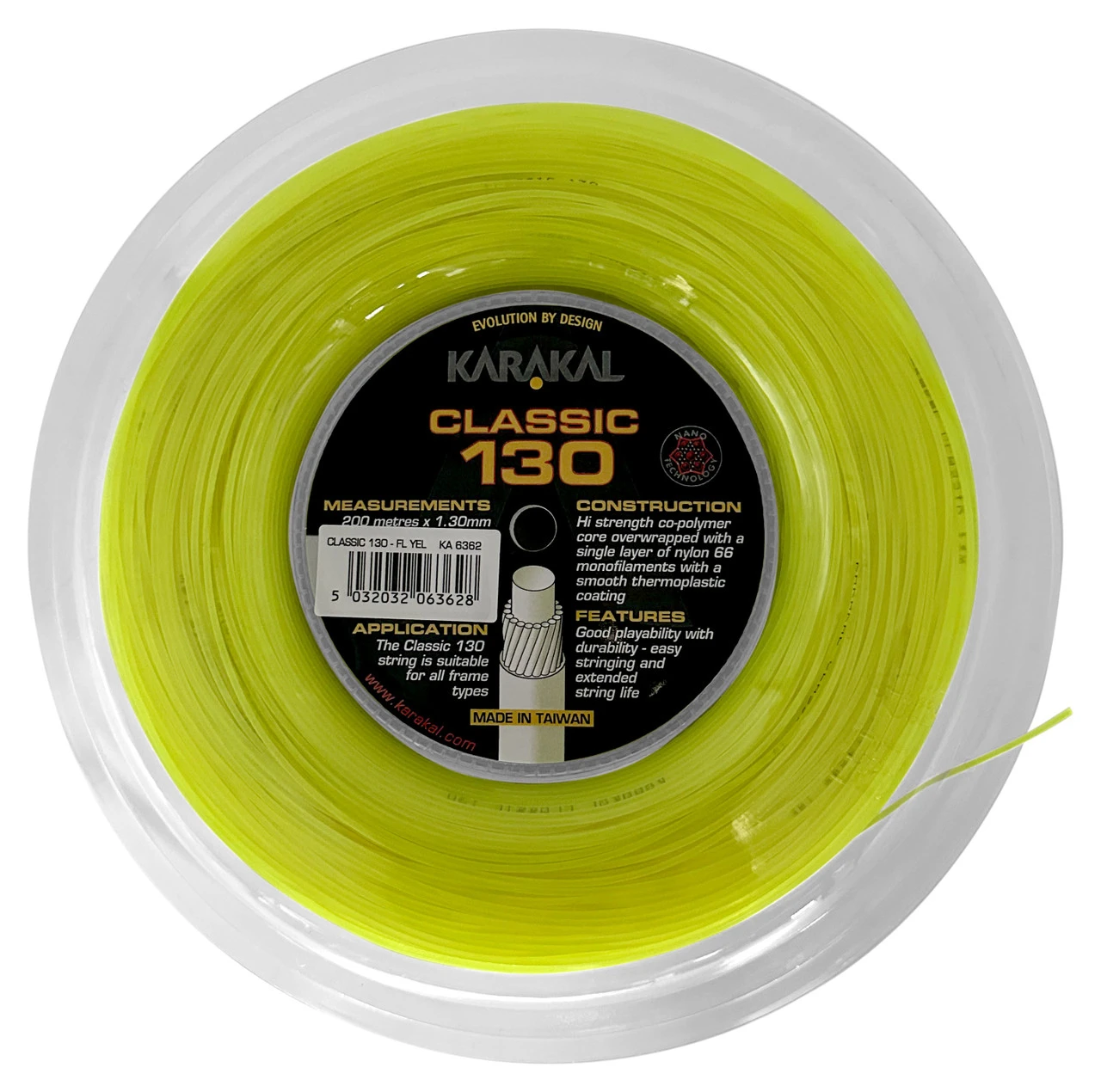 Karakal Classic is a good playability string suitable for all frame types. Classic is constructed using a high strength co-polymer core overwrapped with a single layer of nylon 66 monofilaments with a smooth thermoplastic coating.