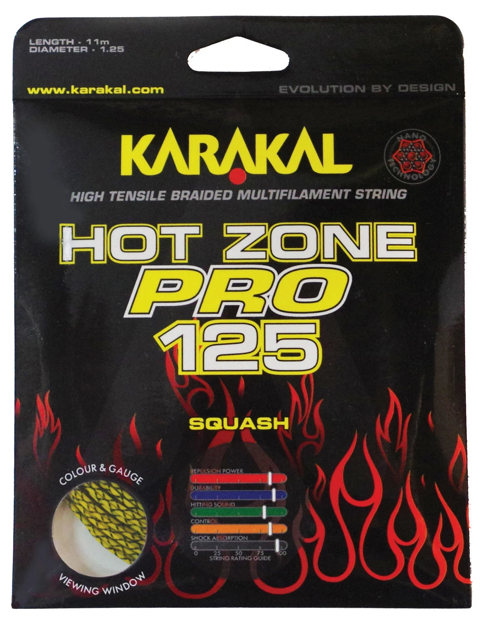 Karakal Hot Zone Pro is a co-polymer multifilament braided string, suitable for high performance and pro players. Featuring a textured nano coating to offer maximum feel, durability and superior power, whilst at the same time retaining high levels of control and consistency, even on touch shots and cut shots.