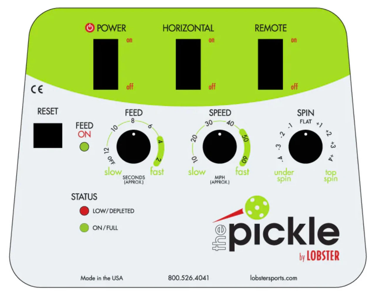 Lobster The Pickle Pickleball Ball Machine is lightweight and is an ideal entry level pickleball ball machine suitable for beginners to intermediate players. The Pickle can offer a variety of shots to challenge your game. Offering heavy top and backspin, throwing balls up to 60mph. The hopper has a 125 ball capacity and can operate up to four hours per charge. Random oscillation and the lob capability allow your game to go to the next level and give you the ability to practice a variety of shots.