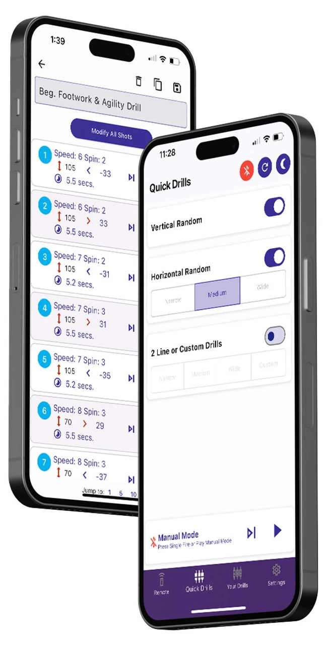 Easily control the machine using the Spinfire App, available for iPhone and Android. Transform your training with unmatched customisation through the advanced AI-Powered Drill Creator. Design precise, personalised practice sessions effortlessly, utilising the app’s full programmability, custom and quick drills, and Random Mode. Just input your desired parameters, and the AI-Powered Drill Creator will generate the drill for you, allowing you to fine-tune the settings or start your perfectly tailored training session right away.