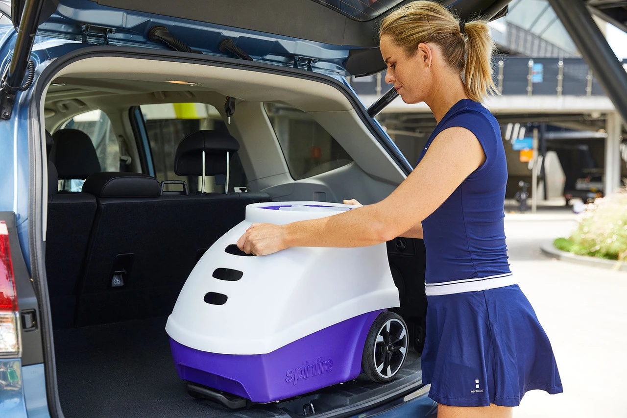 Lightweight and compact, the Spinfire Pickleball Ball Machine fits in the boot of most cars. The white hopper can be reversed to neatly cover the machine. Robust wheels and an extendable handle allow you to pull or push the machine anywhere.