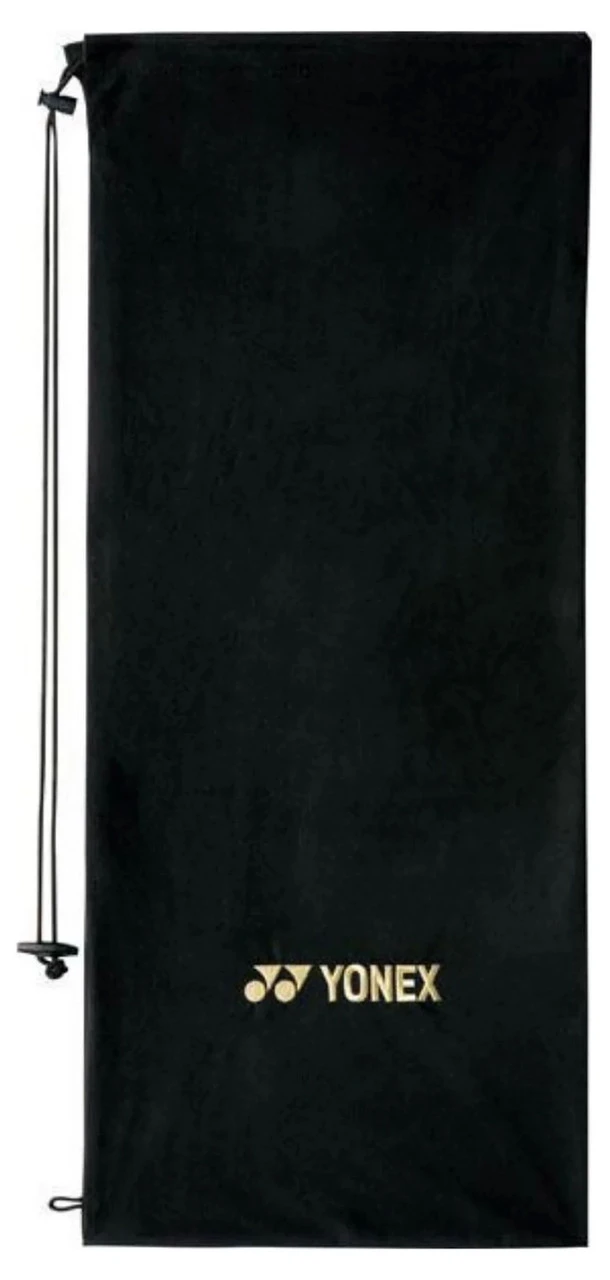 Yonex Badminton Racquet Soft Case is a black fleece drawstring sock case for badminton racquets, featuring gold Yonex name and logo.