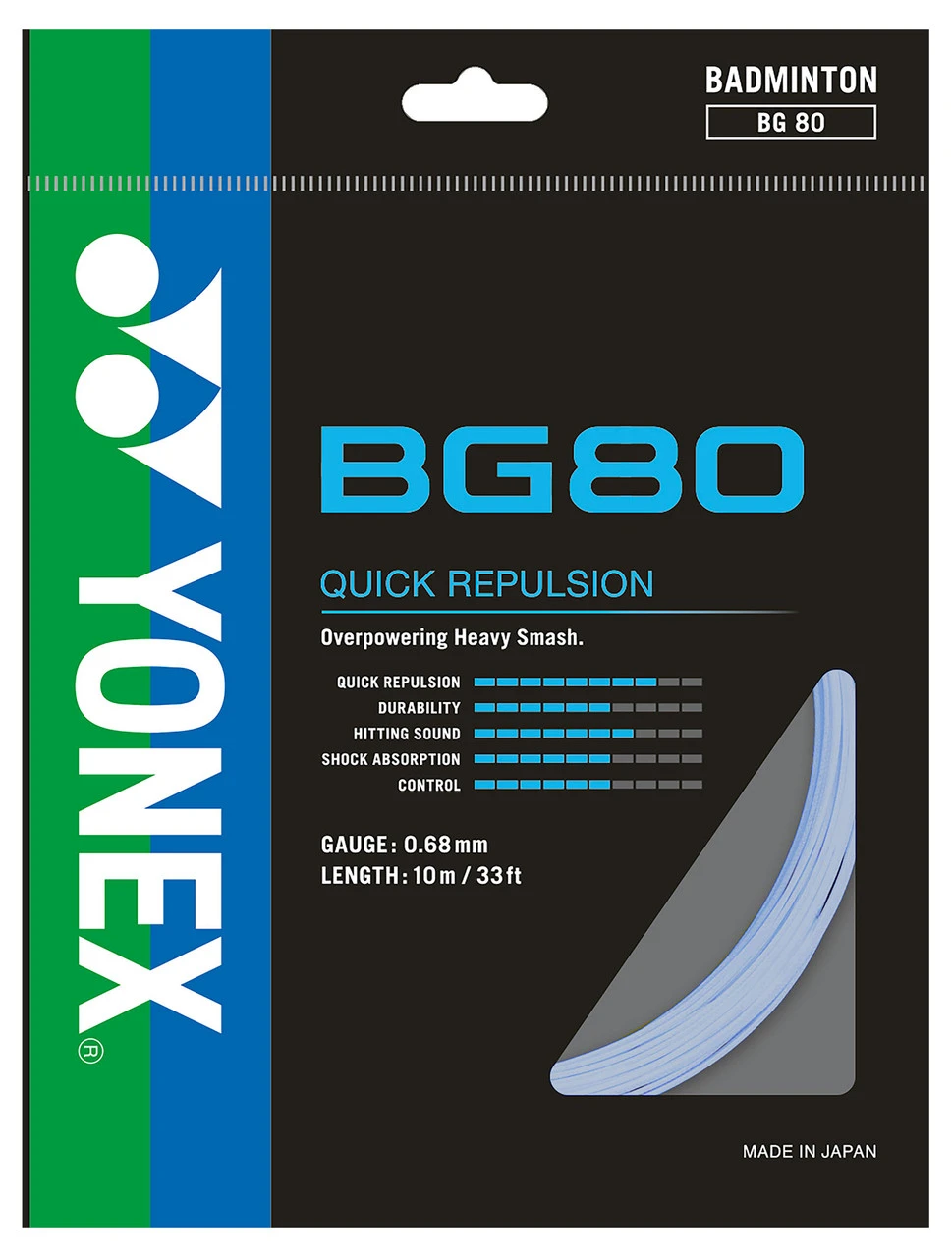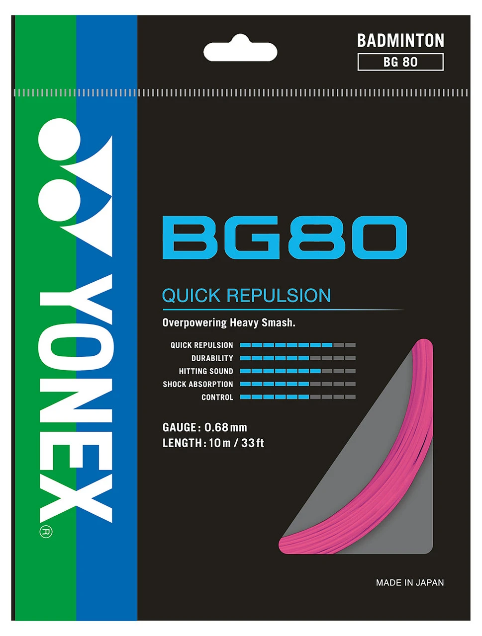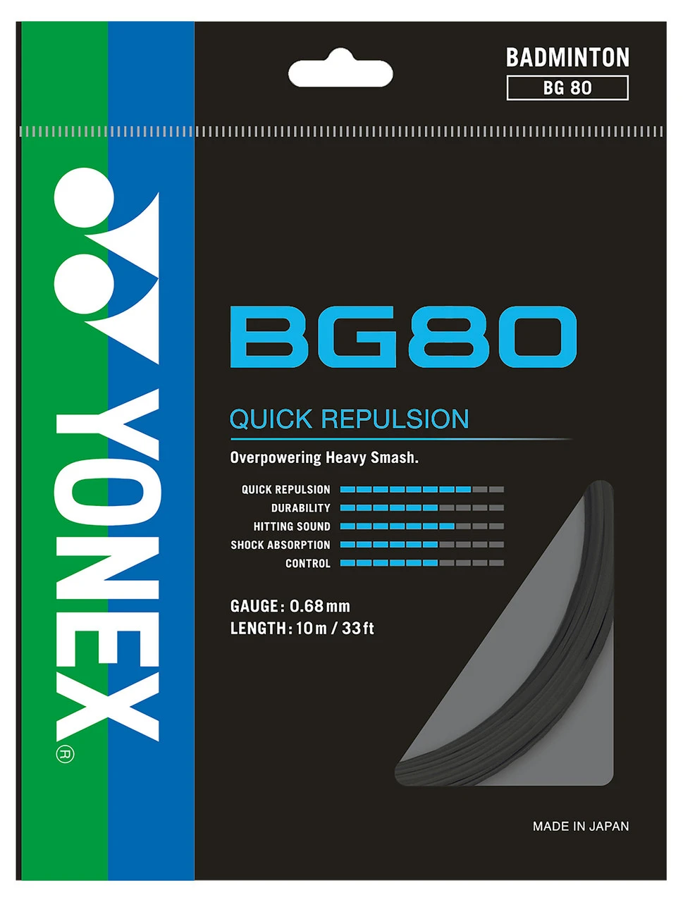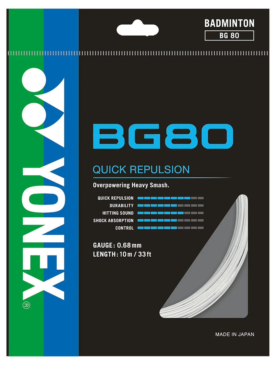 Yonex BG80 has an ultra thin gauge giving excellent playability and power.
